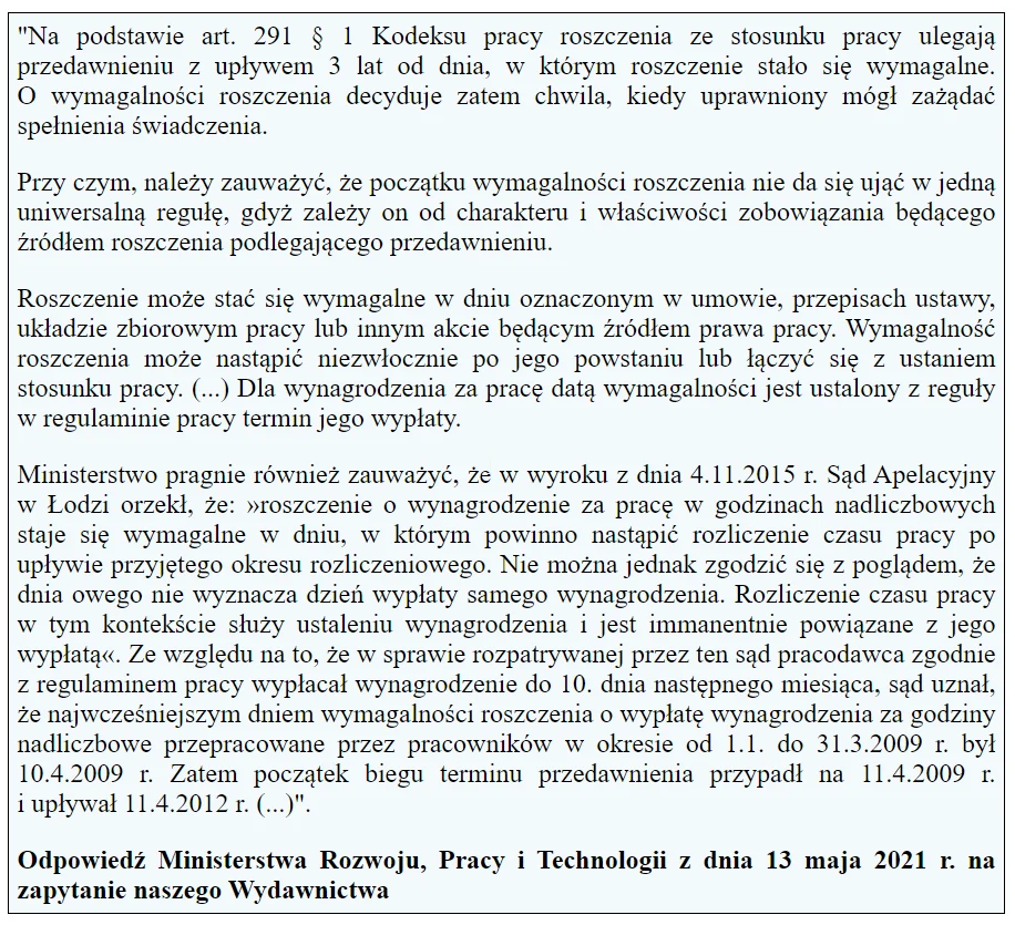 Z pytaniem w tej sprawie nasze Wydawnictwo zwróciło się do Ministerstwa Rozwoju, Pracy i Technologii. W odpowiedzi z dnia 13 maja 2021 r. resort uznał, że okres przedawnienia w sprawach pracowniczych należy liczyć od dnia następnego po dniu wymagalności roszczenia, a nie od dnia wymagalności (patrz ramka).