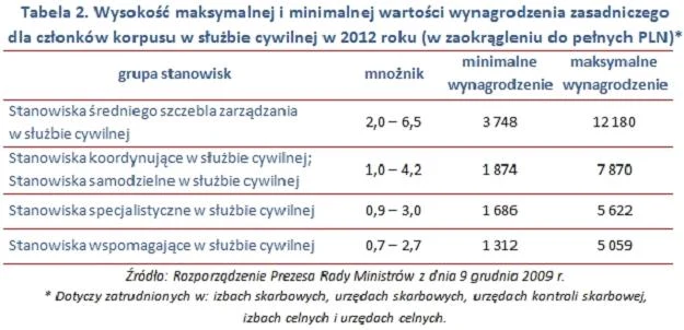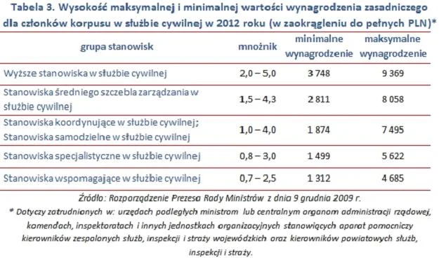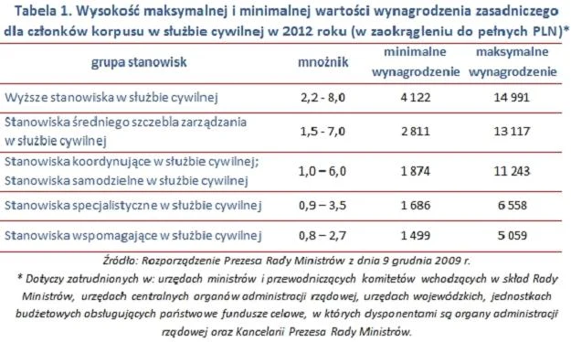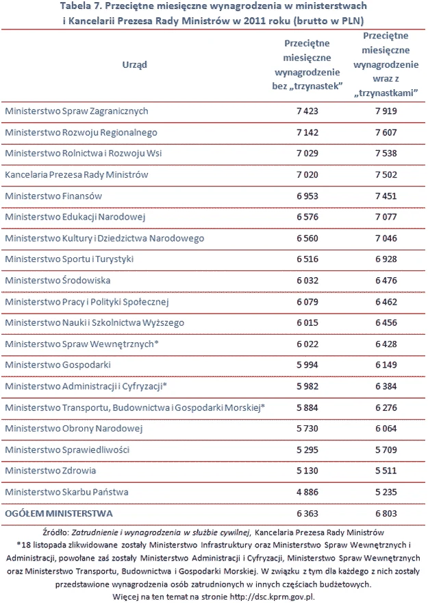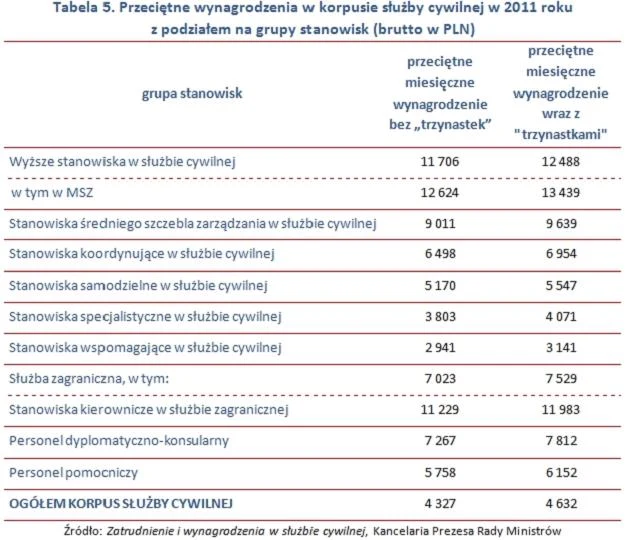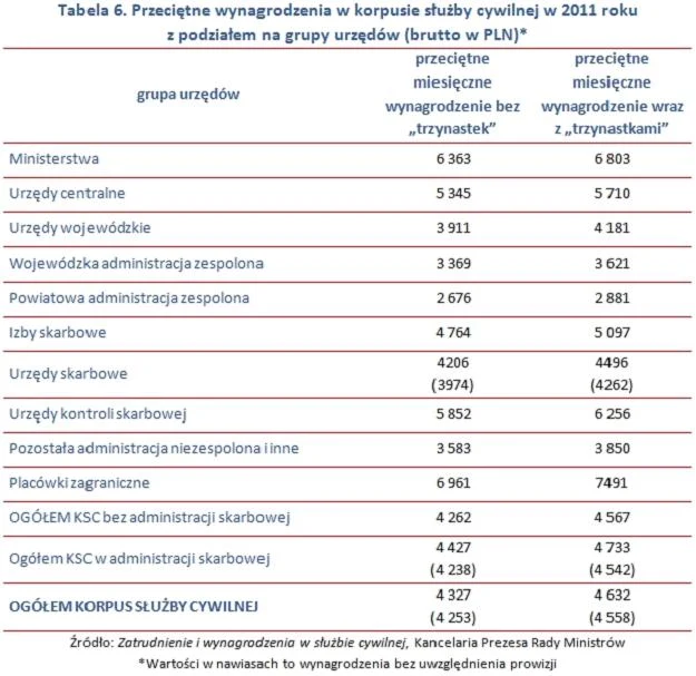 Kancelaria Prezesa Rady Ministrów od 2008 roku publikuje informacje na temat zatrudnienia i przeciętnych wynagrodzeń w służbie cywilnej. Przeciętne wynagrodzenie w 2011 roku wyniosło dla tej grupy 4 327 zł, z uwzględnieniem tzw. "trzynastek" - 4632 zł miesięcznie. Poniżej przedstawiliśmy wynagrodzenia w korpusie służby cywilnej z podziałem na grupy stanowisk, grupy urzędów, ministerstwa (w tym Kancelaria Prezesa Rady Ministrów), urzędów centralnych oraz urzędów wojewódzkich.