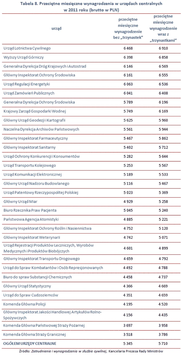 Co się tyczy urzędów centralnych, najwyższe przeciętne miesięczne wynagrodzenie odnotowano w Urzędzie Lotnictwa Cywilnego - 6468 zł brutto (z dodatkowym wynagrodzeniem rocznym 6910 zł). Wysokie średnie płace wypłacano także w Wyższym Urzędzie Górniczym (6398 zł) oraz Głównym Inspektoracie Ochrony Środowiska (6161 zł). Najniższe przeciętne wynagrodzenie odnotowano w 2011 roku w Komendzie Głównej Straży Granicznej - 3518 zł.