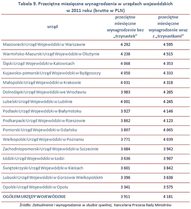 Wynagrodzenia w urzędach wojewódzkich były znacznie nisze niż w centralnych - średnia pensja brutto wynosiła w nich 3911 zł. Przeciętne wynagrodzenie miesięczne w urzędach wojewódzkich (bez "trzynastek) wahało się od 3 341 zł (Opolski Urząd Wojewódzki w Opolu) do 4292 zł (Mazowiecki Urząd Wojewódzki w Warszawie).