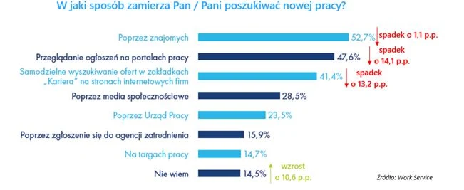 Wówczas było to 72,4 proc. respondentów, a obecnie ten odsetek wynosi 52,7 proc. Spadki odnotowano również na poziomie innych metod szukania nowego zatrudnienia.