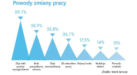 Pracownicy zapytani o kluczowe powody zmiany pracy w pierwszej kolejności wskazują zbyt niskie zarobki u obecnego pracodawcy. Takiej odpowiedzi udzieliło 59,1 proc. respondentów i stanowiło to wynik o 10 pp. wyższy w stosunku do badania z początku roku. Na drugim miejscu znalazły się ograniczone możliwości awansu (38,9 proc.) a na trzecim chęć samorealizacji (33,8 proc.).