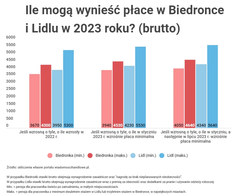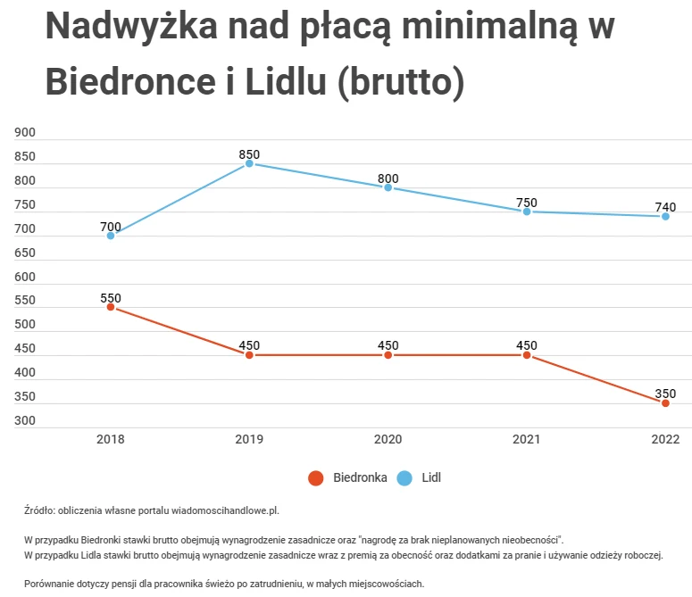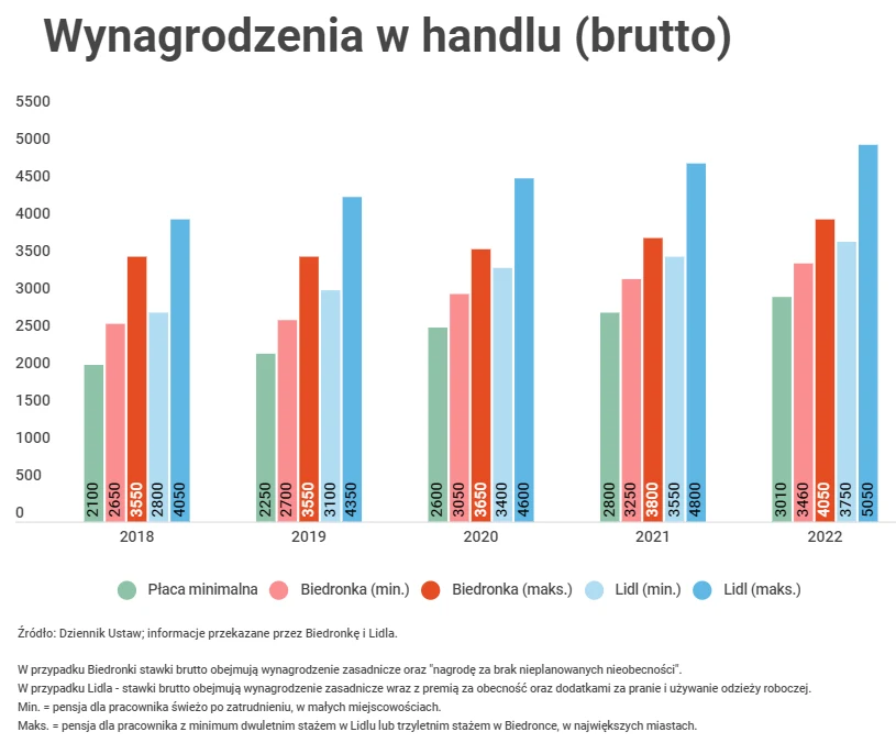 W między 2018 a 2022 r. płaca minimalna w Polsce wzrosła o 910 zł brutto. W tym czasie najniższe pensje szeregowych pracowników dyskontów w Biedronce podskoczyły o 810 zł, a najwyższe o 500 zł (przy uwzględnieniu wynagrodzeń zasadniczych oraz "nagrody za brak nieplanowanych nieobecności", bez uwzględnienia ewentualnych premii za realizację celów ustalonych dla załogi sklepów). Natomiast w Lidlu w omawianym okresie najniższe pensje wzrosły mocniej niż płaca minimalna, bo o 950 zł, za to górna granica pensji sprzedawców-kasjerów podskoczyła o 1 tys. zł.