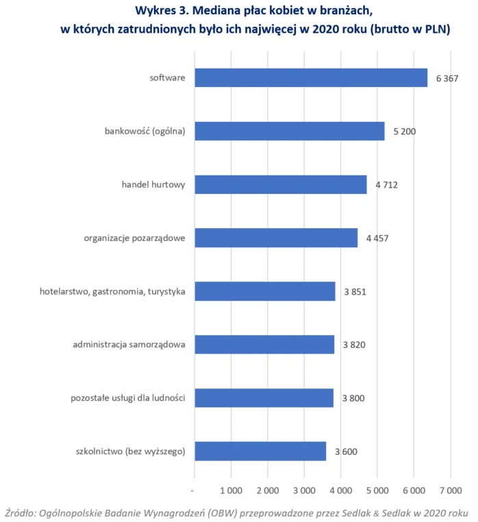 Z branż, w których zatrudnionych jest wiele pań, najwyższe zarobki kobiety otrzymywały w branży software - 6367 zł. Najmniej natomiast w szkolnictwie. Mediana ich płac wyniosła tam 3600 zł.