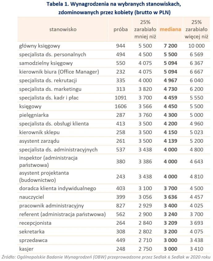 W poniższej tabeli zaprezentowano listę wybranych stanowisk, na których zatrudniane są najczęściej kobiety.