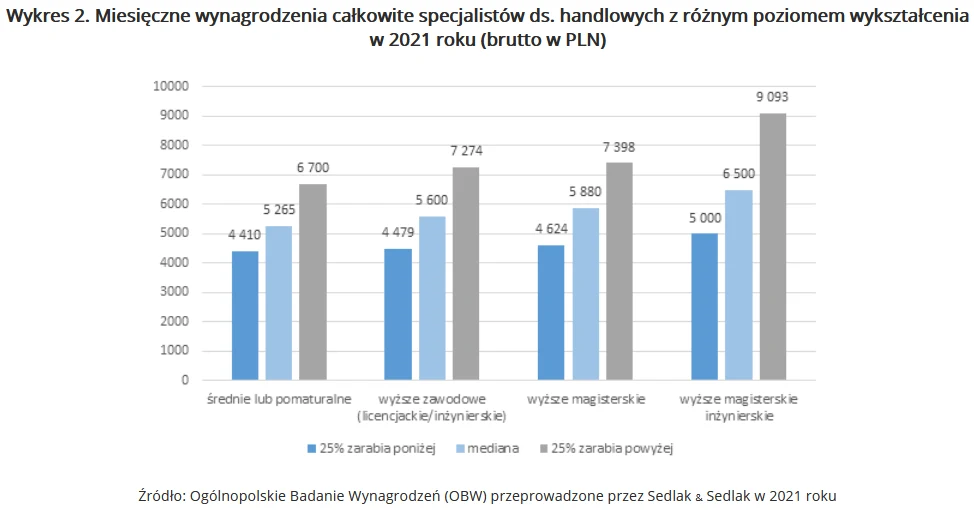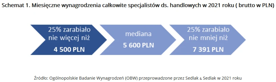 Na podstawie Ogólnopolskiego Badania Wynagrodzeń w 2021 roku przeprowadzono analizę płac specjalistów ds. handlowych. W badaniu wzięło udział 875 specjalistów ds. handlowych. 69 proc. grupy stanowili mężczyźni, 60 proc. miała mniej niż 35 lat, a 74 proc. pracowało w miastach powyżej 100 tys. mieszkańców.
