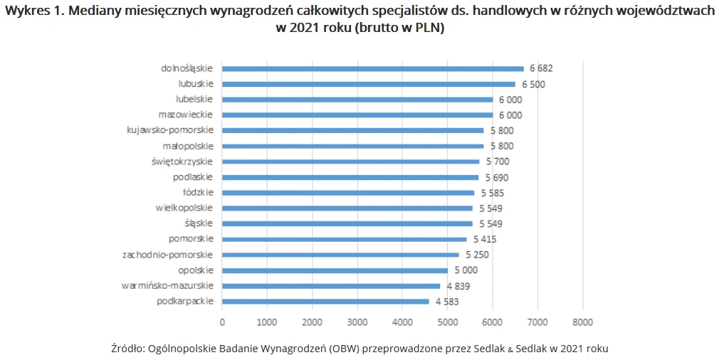 Najwięcej zarabiali specjaliści, którzy pracowali w województwie dolnośląskim. Mediana ich wynagrodzeń wyniosła 6682 zł. Drugim województwem, gdzie oferowano najwyższe wynagrodzenia województwo lubuskie z medianą 6500 zł. Specjaliści o najniższych zarobkach byli zatrudnieni w województwie podkarpackim z medianą równą 4583 zł.