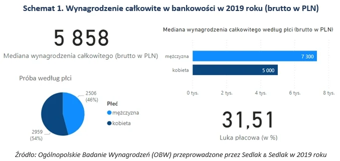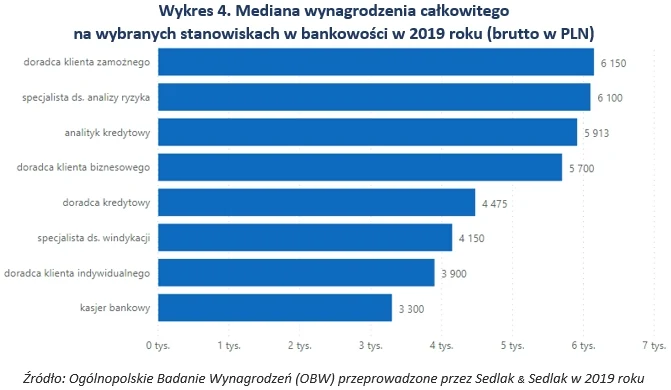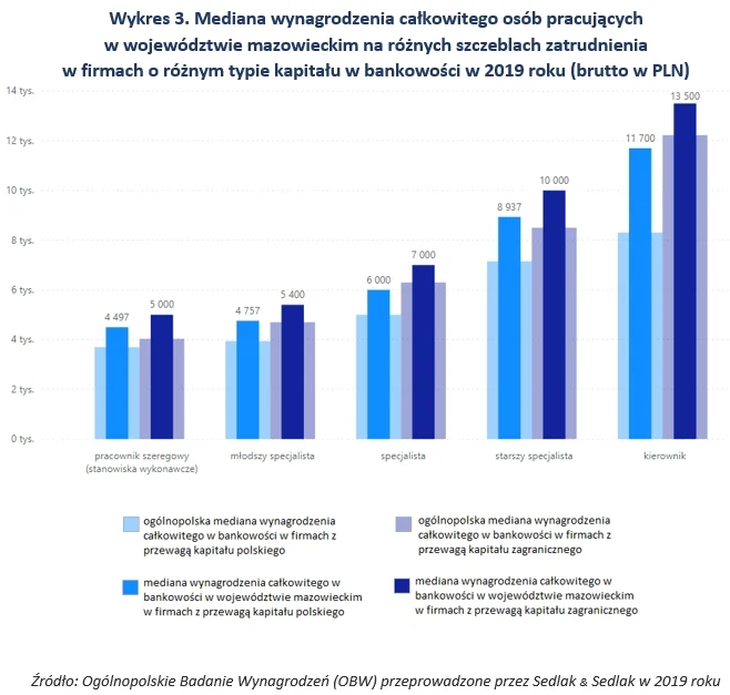 Najwyższe wynagrodzenia w bankowości otrzymywały osoby na stanowiskach kierowniczych. Mediana ich zarobków była 2,5 razy wyższa niż w przypadku pracowników najniższego szczebla. Sytuacja wygląda nieco inaczej biorąc dodatkowo pod uwagę takie kryteria jak kapitał firmy czy województwo. W przypadku przedsiębiorstw zagranicznych mieszczących się na Mazowszu mediana zarobków kierowników była 2,7 razy wyższa niż pracowników szeregowych w tym samym województwie.