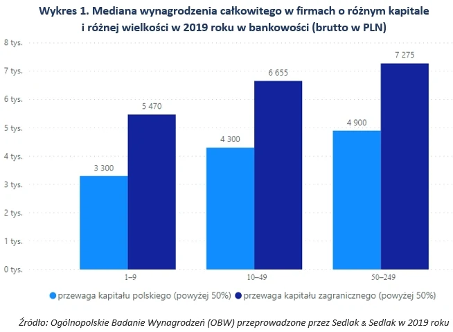 W 2019 roku w bankowości zdecydowanie więcej zarabiały osoby zatrudnione w firmach zagranicznych niż polskich. Najwyższe wynagrodzenia otrzymywali pracownicy w przedsiębiorstwach z przewagą kapitału zagranicznego zatrudniających 50-249 osób (7275 zł). Najniższe zarobki były w polskich mikroprzedsiębiorstwach (3300 zł).