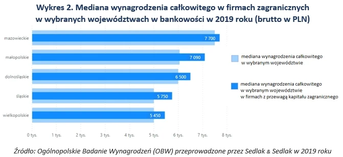 W 2019 roku najwyższe zarobki w bankowości otrzymywali pracownicy zatrudnieni na terenie województwa mazowieckiego. Mediana ich wynagrodzeń wyniosła 7500 zł. Pracownicy zatrudnieni w firmach zagranicznych w tym województwie otrzymywali o 200 zł więcej. Największą różnicę można zauważyć w przypadku małopolski. Mediana wynagrodzeń w firmach zagranicznych w branży bankowości w tej części kraju była o 1033 zł wyższa niż w przypadku zarobków osób zatrudnionych w tym województwie we wszystkich firmach.