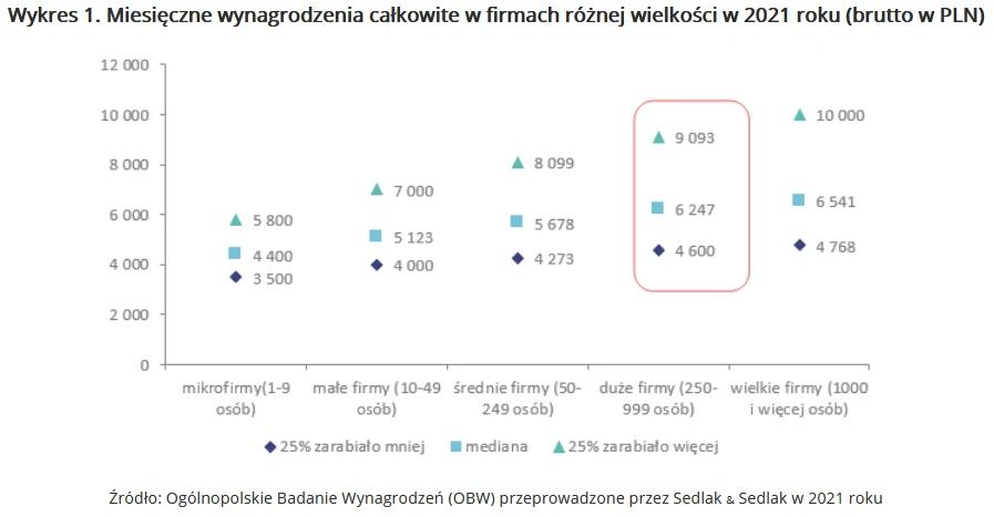 W Ogólnopolskim Badaniu Wynagrodzeń 2021 wzięło udział 19 426 osób pracujących w dużych firmach, co stanowiło 21 proc. badanej próby. W przedsiębiorstwa zatrudniających od 250 do 999 osób pracowali głównie mężczyźni (57 proc.).