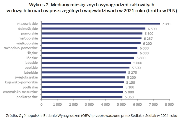 W dużych firmach najwyższe wynagrodzenia otrzymywały osoby zatrudnione w województwie mazowieckim. Mediana ich miesięcznych zarobków wyniosła 7391 zł w 2021 roku. O ponad 890 zł mniej zarabiali pracownicy dużych firm w województwie dolnośląskim (6500 zł). Najniższe pensje w dużych przedsiębiorstwach wystąpiły w województwie warmińsko-mazurskim (5080 zł) i podkarpackim (5060 zł).