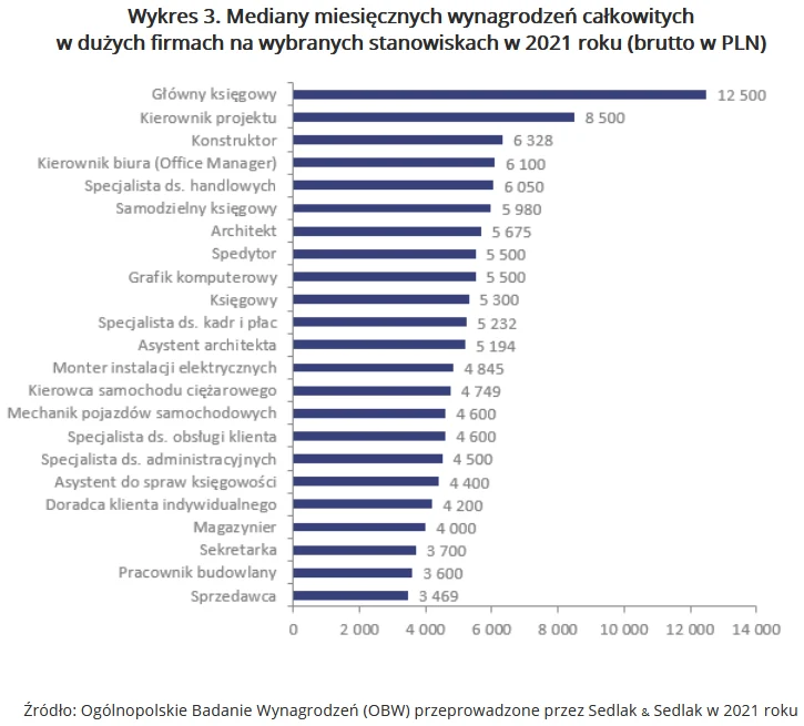 Spośród wybranych stanowisk, które najczęściej pojawiały się w naszym badaniu, najwyższe wynagrodzenia otrzymały osoby zatrudnione na stanowisku głównego księgowego. Mediana ich miesięcznych zarobków wyniosła 12 500 zł. Na drugim miejscu naszego zestawienia znaleźli się kierownicy projektu z medianą na poziomie 8500 zł. Z kolei najniższe pensje występowały w przypadku sprzedawców. W 2021 roku zarabiali oni niecałe 3500 zł.