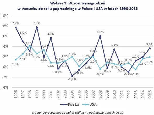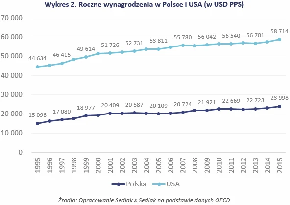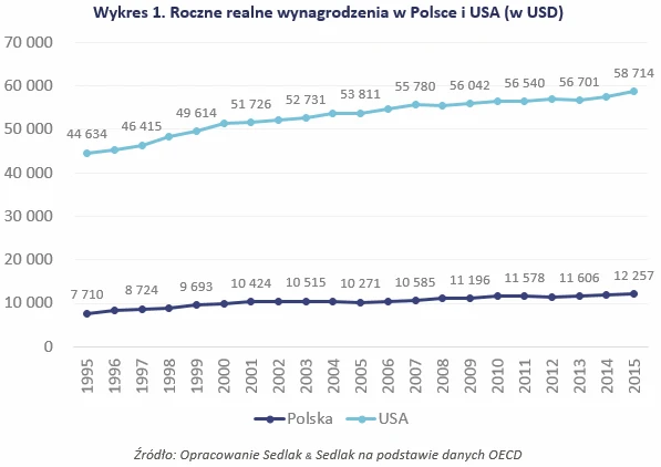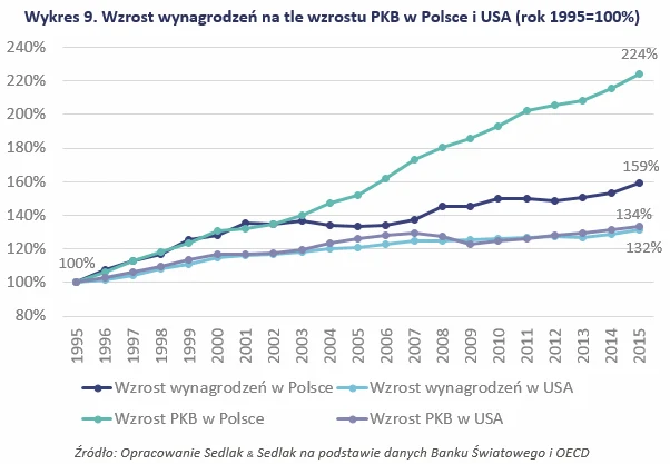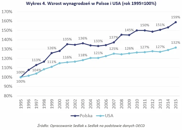 Analizując dynamikę wynagrodzeń z perspektywy Polski można dojść do pozytywnych wniosków. Przyjmując za punkt wyjścia rok 1995 okazuje się, że wynagrodzenia w Polsce do 2015 r. wzrosły o 59 proc. W USA wzrost ten był niższy i wyniósł 32 proc.