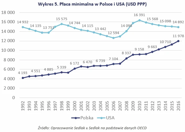 Kolejnym ważnym aspektem wynagrodzeń jest płaca minimalna. Porównując wartości wyrażone w USD jako parytet siły nabywczej widać, że w USA jest ona wyższa. Stwierdzić jednak należy, że w Polsce widać jej szybki wzrost. W 1992 r. w Stanach Zjednoczonych pensja minimalna była o przeszło 10 000 USD PPP wyższa niż w Polsce. W 2016 r. różnica ta wyniosła już niecałe 3000 USD PPP.