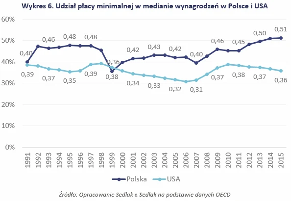 Następnym ważnym zagadnieniem związanym z płacą minimalną jest jej udział w medianie wynagrodzeń. Okazuje się, że w badanym okresie wskaźnik ten (nie licząc 1999 r.) w Polsce był wyższy niż w USA. W 2015 r. w Polsce był on rekordowo wysoki. Wtedy to wartość płacy minimalnej przekroczyła 50 proc. mediany ogólnokrajowej.