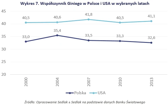 Analizując wynagrodzenia warto też zwrócić uwagę na rozkład dochodów w społeczeństwie. Miarą nierówności dochodów jest współczynnik Giniego. Im wyższa jego wartość tym zróżnicowanie dochodów jest większe. Porównując pod tym względem oba kraje okazuje się, że rozwarstwienie dochodów w Polsce jest znacznie niższe niż w USA i dodatkowo od 2004 roku regularnie spada.