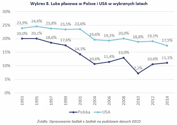 Następnym zagadnieniem rozkładu dochodów w społeczeństwie jest luka płacowa, czyli różnica pomiędzy wynagrodzeniami kobiet i mężczyzn. W obu krajach różnica ta regularnie się zmniejsza. Trzeba jednak zaznaczyć, że różnica pomiędzy wynagrodzeniami kobiet i mężczyzn w Polsce jest mniejsza niż w Stanach Zjednoczonych.