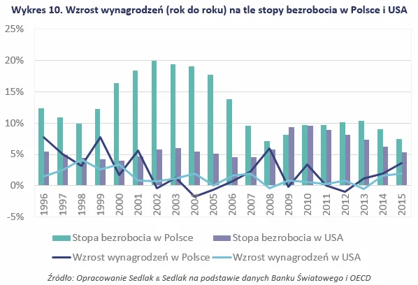 Do ciekawych wniosków można również dojść, zestawiając wynagrodzenia z poziomem bezrobocia. Polska na przełomie XX i XXI wieku borykała się z dwucyfrowym bezrobociem, co odbiło się na niższej dynamice płac. Bezrobocie w Stanach Zjednoczonych na ogół przyjmowało wartości jednocyfrowe i tylko w 2009 r. było ono wyższe niż w Polsce.