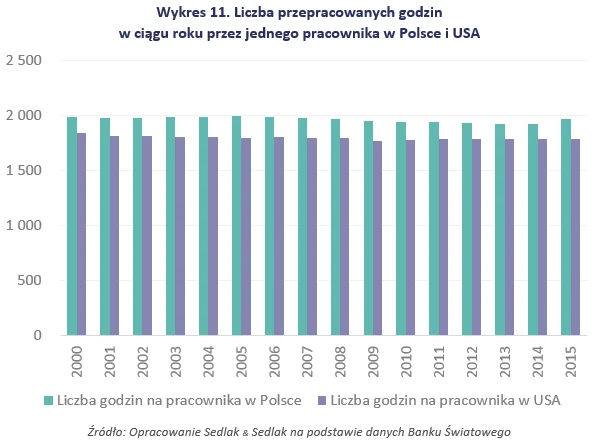 Ostatnim etapem analizy jest zaprezentowanie średniej liczby godzin przypadającej na jednego pracownika. Okazuje się, że Polacy spędzają w pracy więcej czasu niż Amerykanie.