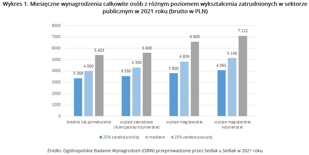 Najwyższe wynagrodzenia otrzymywały osoby z tytułem magistra inżyniera. Mediana zarobków w tej grupie wyniosła 5146 zł. Najniższe wynagrodzenia otrzymywały osoby z wykształceniem średnim, bądź pomaturalnym, gdzie mediana płac wyniosła 4000 zł.