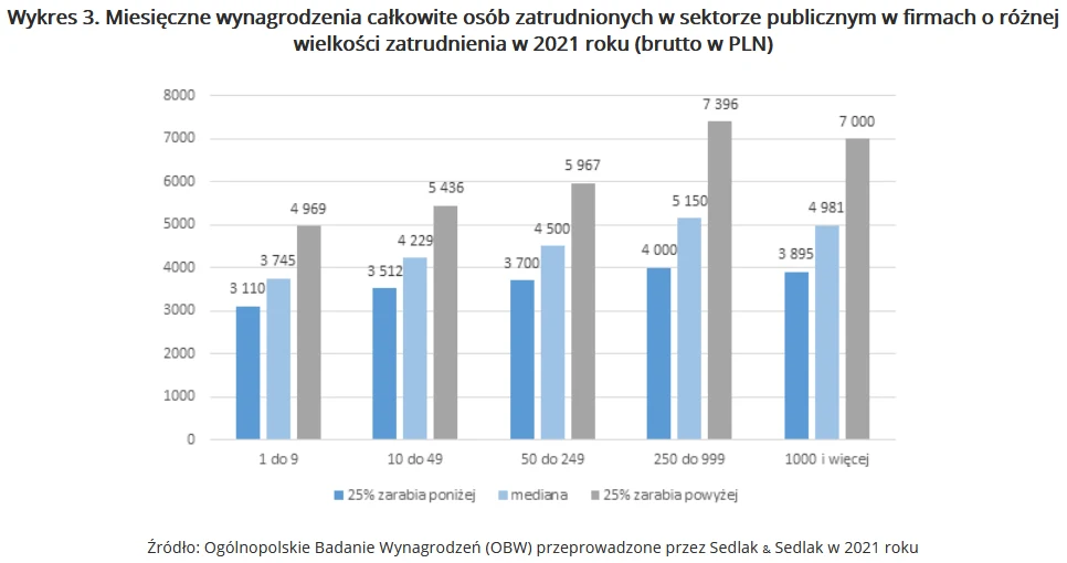Najniższe wynagrodzenia otrzymywały osoby z firm zatrudniających od 1 do 9 pracowników. Mediana ich płac wyniosła 3745 zł. Najwyższe wynagrodzenia otrzymywały osoby z firm o wielkości zatrudnienia od 250 do 999 pracowników. Mediana wynagrodzeń w tej grupie równa była 5150 zł. Niewiele mniej zarabiały osoby z firm posiadających ponad 1000 pracowników. Mediana w tej grupie wyniosła 4981 zł.