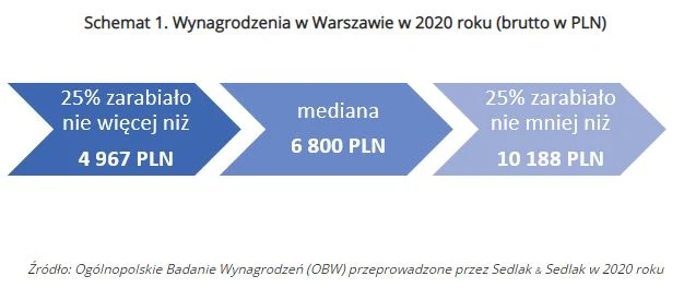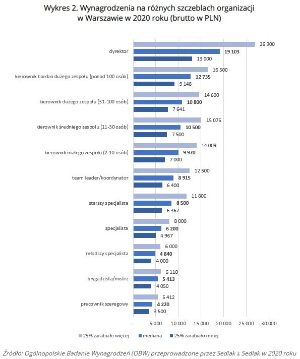 Mediana zarobków dyrektorów w Warszawie wyniosła 19 103 zł. Kierownicy bardzo dużych zespołów zarabiali przeciętnie o 6000 zł mniej. Natomiast specjaliści zarabiali w przedziale 4840 do 8500 zł. Mediana płac pracowników szeregowych wyniosła 4220 zł, co stanowi trochę mniej niż ¼ zarobków dyrektorów.
