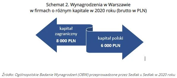 Według Ogólnopolskiego Badania Wynagrodzeń pracownicy firm o zagranicznym kapitale mogli zarobić o nawet 2000 zł więcej niż pracownicy firm z rodzimym kapitałem.