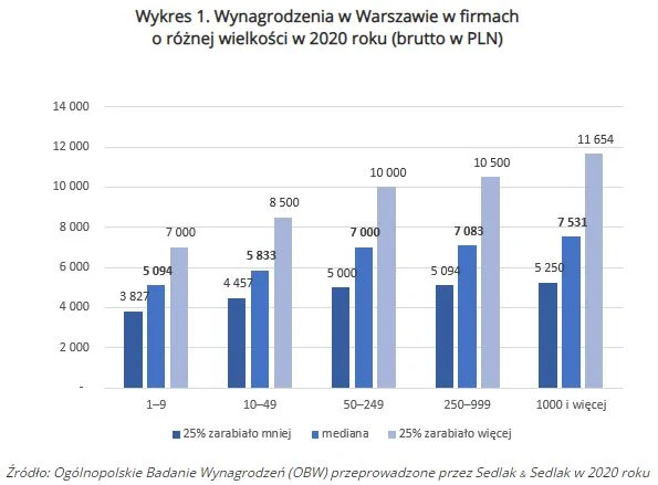 Pracownicy w Warszawie zarabiali najwięcej w firmach zatrudniających 1000 i więcej pracowników. Mediana ich zarobków to 7531 zł. Połowa badanych zatrudnionych w największych organizacjach zarabiała w przedziale od 5250 do 11 654 zł. Natomiast w najmniejszych firmach, do 9 pracowników mediana płac była niższa o prawie 2500 zł i wynosiła 5094 zł.
