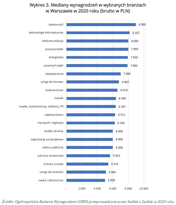 Najwyższe płace spośród wybranych branż otrzymywali pracownicy zatrudnieni w bankowości (8980 zł), technologiach informatycznych (8167 zł) oraz telekomunikacji (8000 zł). Najniższe natomiast wynagrodzenia otrzymywali zatrudnieni w branży usług dla ludności oraz nauce i szkolnictwie, mediany ich płac wynosiły odpowiednio 5094 zł i 5000 zł.