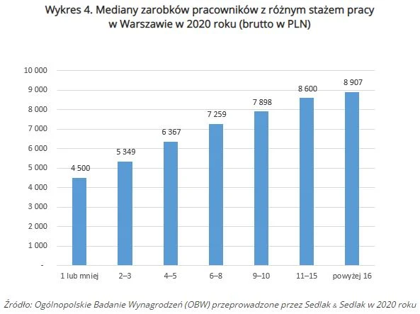 Najwyższe płace w Warszawie otrzymywali pracownicy ze stażem pracy powyżej 16 lat. Mediana ich wynagrodzeń to 8907 zł. Około 300 zł mniej zarabiały osoby ze stażem wynoszącym 11-15 lat. Natomiast pracownicy ze stażem równym lub krótszym niż rok zarabiali trochę więcej niż 50 proc. tego, co otrzymywali pracownicy z najdłuższym stażem.