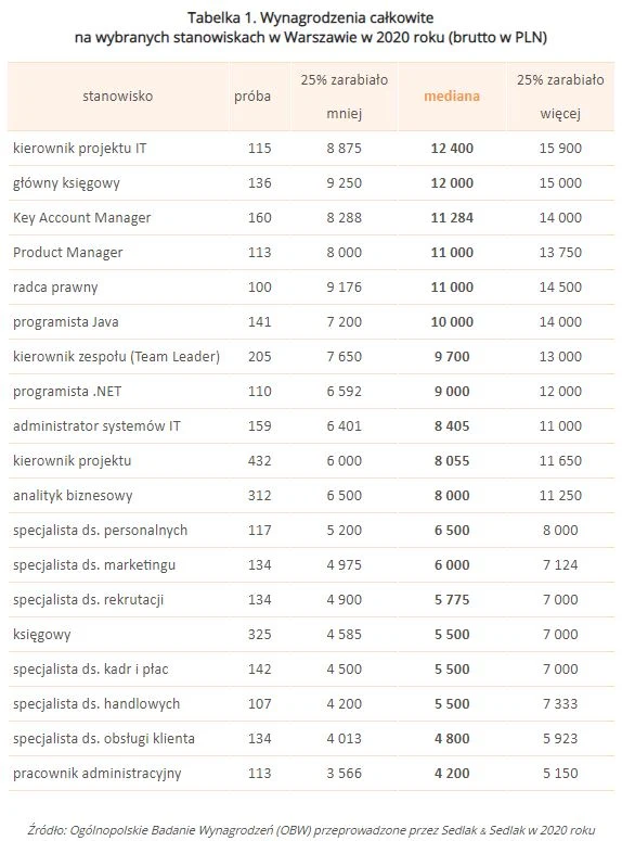 W poniższej tabeli zaprezentowane zostały wynagrodzenia całkowite na wybranych stanowiskach w Warszawie.