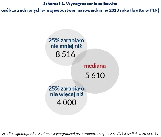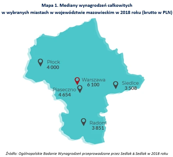 Najwyższe zarobki otrzymywali pracownicy zatrudnieni w stolicy kraju. Warszawiacy zarabiali 6100 zł, co jest kwotą wyższą od mediany ogólnopolskiej o 1600 zł. Niższe były natomiast zarobki w pozostałych miastach województwa mazowieckiego. W Siedlcach i Radomiu mediany zarobków nie przekroczyły 4000 zł.