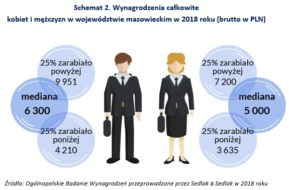 Mediana zarobków całkowitych kobiet była o 1300 zł niższa niż mediana płac mężczyzn. Natomiast 25 proc. najlepiej zarabiających mężczyzn zarabiało o 2751 zł więcej od 25 proc. najlepiej wynagradzanych kobiet. Różnica w grupie najniżej opłacanych pracowników wynosiła jedynie 575 zł.