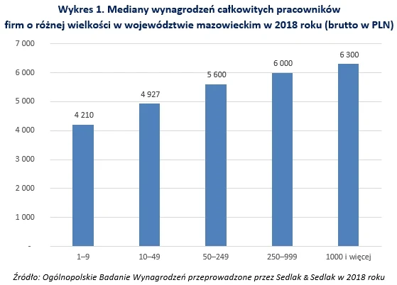 Najniższe płace otrzymywali pracownicy z firm zatrudniających do 9 osób. Mediana ich wynagrodzeń wyniosła 4210 zł. W firmach zatrudniających 1000 i więcej osób, pracownicy otrzymywali 2000 zł więcej.
