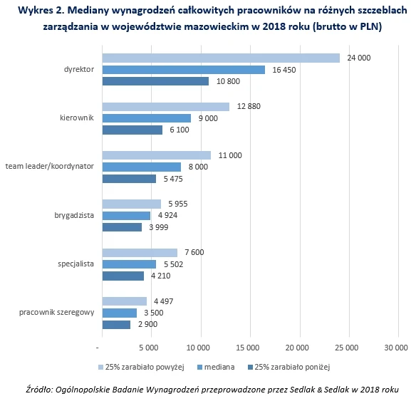 Najniższe płace otrzymywali pracownicy szeregowi, mediana ich zarobków to 3500 zł. Natomiast mediana zarobków dyrektorów wyniosła 16 450 zł. 25 proc. najniżej opłacanych pracowników szeregowych otrzymywało płace stanowiące jedynie 12 proc. pensji 25 proc. najwyżej wynagradzanych dyrektorów.