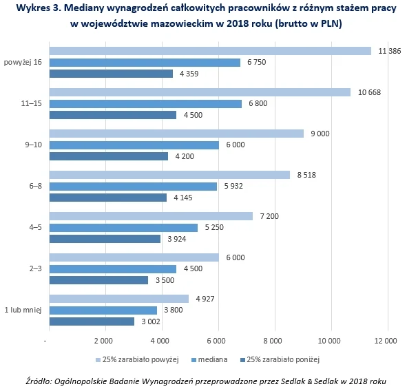 Najniżej opłacani byli pracownicy o stażu pracy krótszym lub równym jednemu roku. Mediana ich płac wyniosła 3800 zł. Z kolei najwięcej otrzymywali pracownicy, których staż pracy wynosił 11-15 lat - 6800 zł.