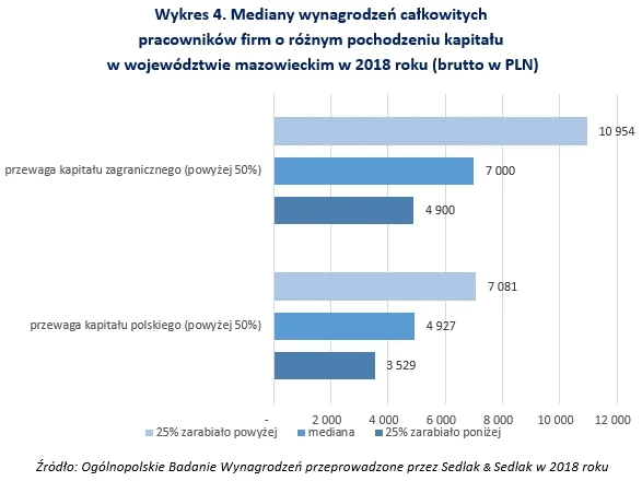 Według Ogólnopolskiego Badania Wynagrodzeń, pracownicy firm o przewadze kapitału zagranicznego zarabiali o ponad 2000 zł więcej niż zatrudnieni w polskich firmach. Mediana zarobków w firmach o obcym kapitale wyniosła 7000 zł.