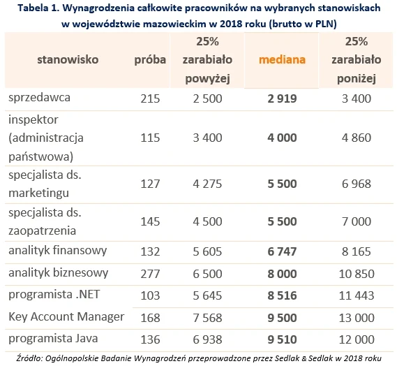 Poniższa tabela prezentuje zarobki na wybranych stanowiskach w województwie mazowieckim.