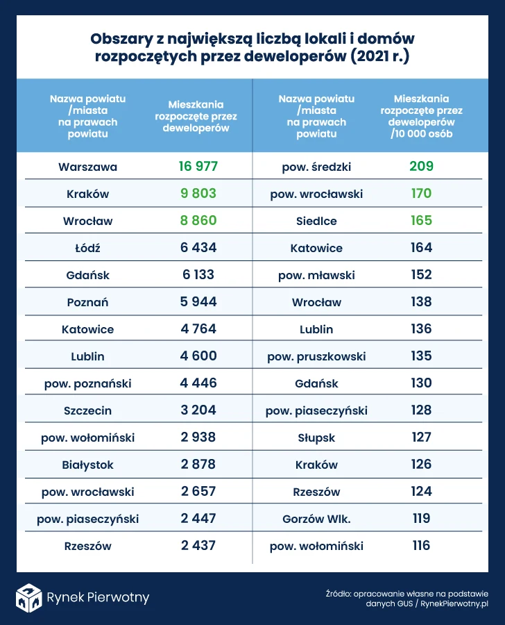 Poniższa tabela prezentuje wyniki powiatów oraz miast, które cechowały się najwyższym poziomem aktywności budownictwa deweloperskiego - zarówno w ujęciu bezwzględnym, jak i po przeliczeniu liczby rozpoczętych mieszkań na 10 000 osób. Zacznijmy od bardziej oczywistych wyników, które informują, ile lokali i domów przez cały 2021 r. deweloperzy rozpoczęli na największych rynkach.