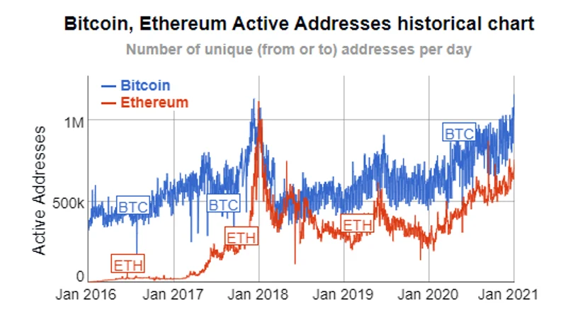 Ten zakres zastosowań jest obecnie znacznie ograniczony, ponieważ sieć ethereum umożliwia przetwarzanie jedynie niewielkiej liczby transakcji na sekundę. Oznacza to wysokie opłaty transakcyjne, ponieważ uczestnicy rynku walczą o przepustowość, dlatego też aktualizacja do ETH 2.0 ma kluczowe znaczenie dla rozwoju sieci. Wolumen użytkowników sieci ethereum, mierzony liczbą unikalnych aktywnych adresów, nadal plasuje się znacznie poniżej szczytowej aktywności z końca 2017 r., w przeciwieństwie do bitcoina, w przypadku którego liczba aktywnych adresów osiąga nowe maksima (patrz wykres poniżej).