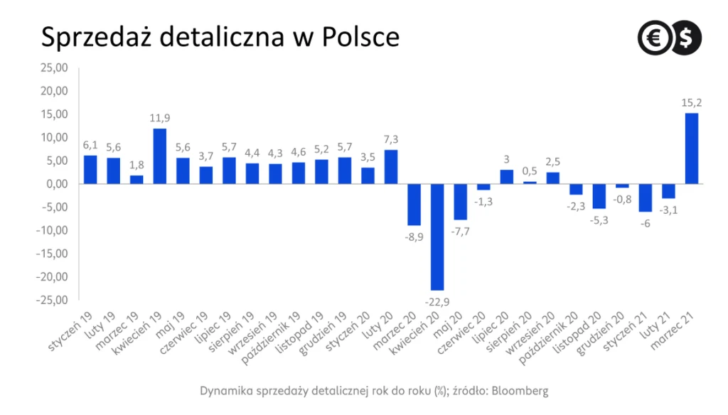 Dodajmy, że wiszące w powietrzu zaostrzenie restrykcji i wcześniej wypadająca Wielkanoc również podbiły statystyki. Choć ich wartości to ewidentnie pandemiczna anomalia, na perspektywy konsumpcji należy patrzeć optymistycznie. Przemawia za tym dość mocny (choć nie aż tak jak sugerowałyby dane o wynagrodzeniach) rynek pracy oraz wizja realizacji odroczonego popytu. Za zwiastun tego, czego możemy spodziewać się po gospodarce Polski czy Eurolandu, mogą służyć dane z Wielkiej Brytanii, które sugerują bardzo duży impet.
