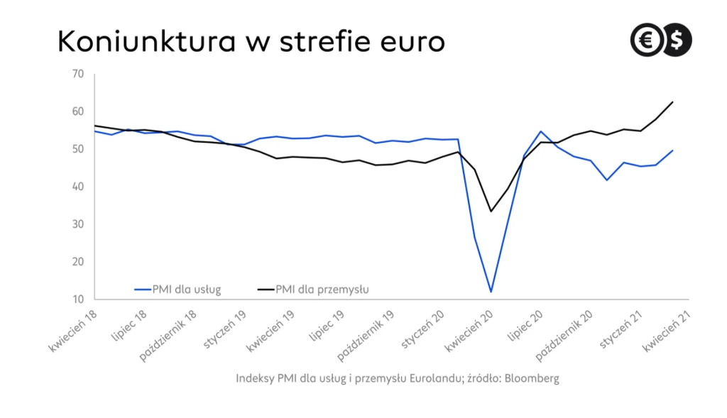 Dobre nastroje i optymistyczne spojrzenie w przyszłość potwierdzają barometry koniunktury - indeksy PMI. Wskaźnik dla usług strefy euro po zaskakującym podbiciu w poprzednim miesiącu kontynuuje wzrost. Co więcej, powrócił ponad barierę 50 pkt, która oddziela jego regres od rozwoju, po raz pierwszy od sierpnia ubiegłego roku i przybiera trzecią z najwyższych wartości od początku pandemii koronawirusa.