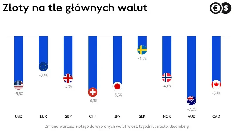 W gronie głównych walut słabością razi euro. Inwestorzy nadal zdecydowanie preferują franka, dolara, a nawet funta. Kurs EUR/USD spada w kierunku 1,10, a kurs wspólnej waluty w relacji do franka zmierza do parytetu. Przekłada się to na jeszcze mocniejsze wzrosty kursów wspomnianej trójki. Kurs dolara przekraczał dziś rano 4,40 zł i w tym tygodniu podniósł się ponad 7 proc. Ostatni raz amerykańska waluta kosztowała więcej w 2001 roku. Notowania franka podbiły od napaści Rosji na Ukrainę o ponad 8 proc., naruszały 4,80 zł i były najwyżej w historii. Postępujące umocnienie szwajcarskiej waluty musi wzbudzać niepokój u władz monetarnych tego kraju. W tym przypadku nie można wykluczyć interwencji, które - odwrotnie niż w przypadku złotego - miałyby ograniczać jej siłę.