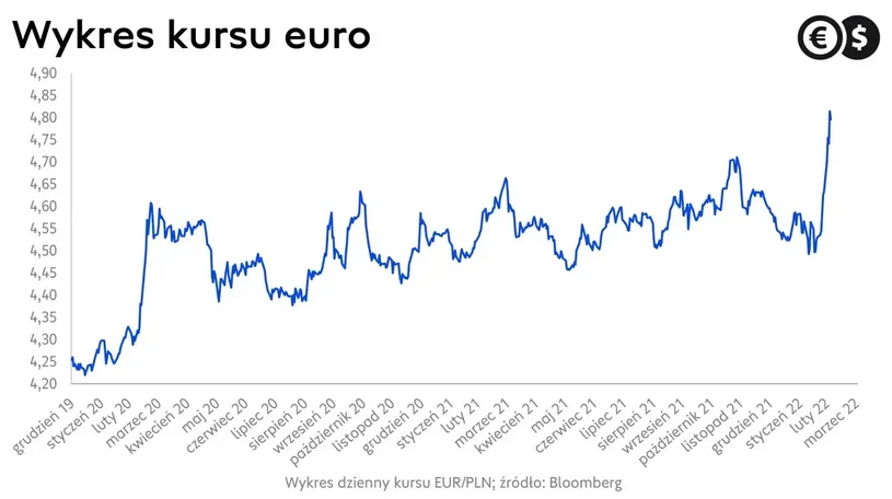Kluczowa będzie reakcja NBP. Spodziewamy się, że w przyszłym tygodniu stopy zostaną podniesione o kolejne 50 pkt bazowych, do 3,25 proc., co będzie korzystne dla naszej waluty. Pod znakiem zapytania stoją przede wszystkim pułap, przy którym zakończy się cykl i tempo podwyżek na kolejnych posiedzeniach. Wracając do złotego: inwestorzy w kolejnych miesiącach mogą w wycenie walut regionu uwzględniać większą premię za ryzyko geopolityczne. Innymi słowy: wartość godziwa złotego będzie niższa niż przed rosyjską napaścią i zejście EUR/PLN do 4,50 w tym roku w tej chwili może jawić się jako optymistyczny scenariusz.