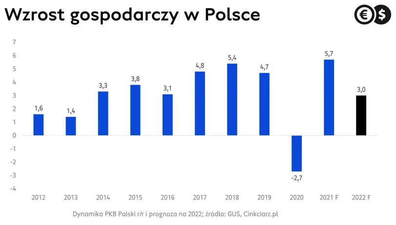 Tarapaty złotego, choć są bardzo głębokie, powinny okazać się przejściowe. Na razie nie można rzetelnie tego oszacować, ale rozpętana przez Rosję wojna i idące za nią przyspieszenie inflacji (ropa od początku roku podrożała przeszło o połowę, mocno drożeją płody rolne) pogorszą perspektywy wzrostu gospodarczego zarówno w Polsce, jak i u naszych najistotniejszych parterów handlowych. Jeszcze miesiąc temu prognozy Cinkciarz.pl zakładały, że dynamika PKB w tym roku wyniesie około 4,5 proc. i spowolni z 5,7 proc. rok do roku. W tej chwili obawiamy się, że bardziej prawdopodobny jest o połowę gorszy wynik niż w 2021 roku.