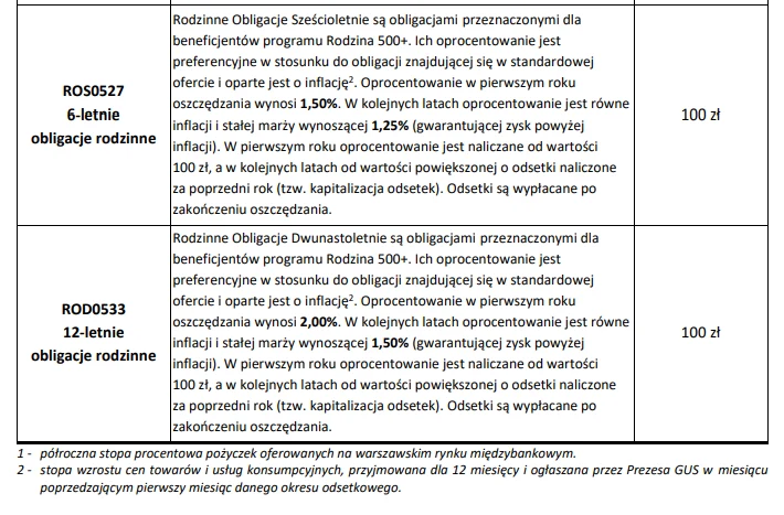 Oprocentowanie obligacji rodzinnych, ulega zmianie co roku i jest wyliczane na podstawie sumy wskaźnika inflacji z ostatnich 12 miesięcy oraz preferencyjnej marży wynoszącej 1,25 proc. dla obligacji 6-letnich oraz 1,50 proc. dla 12-letnich. W maju standardowo oferujemy do sprzedaży obligacje oszczędnościowe o terminie zapadalności od 3 miesięcy do 10 lat i oprocentowaniu od 0,50 proc. do 1,70 proc. w pierwszym roku oszczędzania oraz 6- i 12-letnie instrumenty rodzinne z kuponem odpowiednio 1,50 proc. i 2,00 proc.