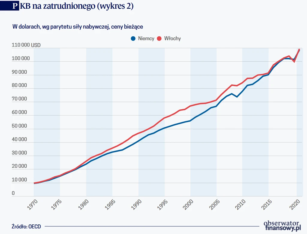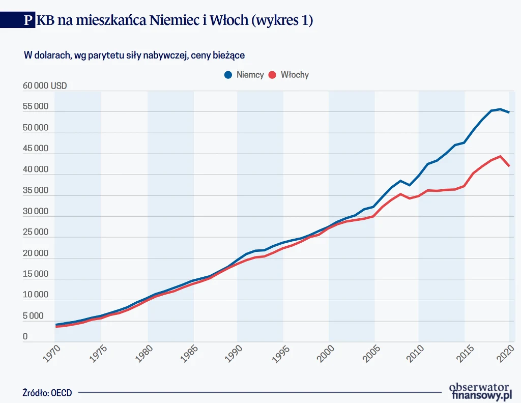 Sporo mówiono dawniej o powojennym "niemieckim cudzie gospodarczym". Mniej o "cudzie włoskim". Taki miał jednak niewątpliwie miejsce. Trwał do początku XXI w. - do momentu zastąpienia własnej waluty euro. Dowodzi tego trajektoria włoskiego PKB na mieszkańca, przez dziesięciolecia pokrywająca się z trajektorią niemiecką.
