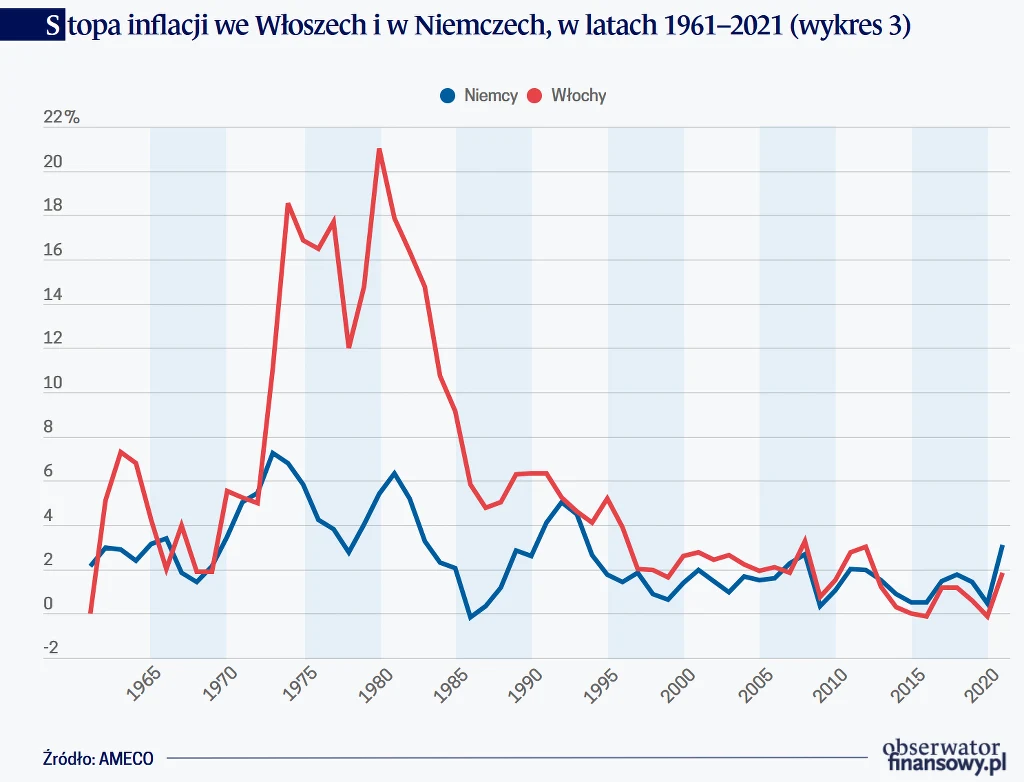 Upadek (w 1973 r.) systemu Bretton Woods (ograniczającego swobodę międzynarodowych przepływów kapitału prywatnego i usztywniającego kursy wymienne walut) zapoczątkował erę wysokiej inflacji we Włoszech i relatywnie niskiej inflacji w Niemczech.