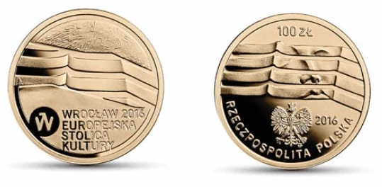 Na monecie złotej zaprezentowany został architektoniczny motyw schodów Narodowego Forum Muzyki we Wrocławiu. Na awersie, w motyw ten, został wkomponowany wizerunek twarzy antycznej rzeźby - symbolu antycznych korzeni europejskiej kultury.